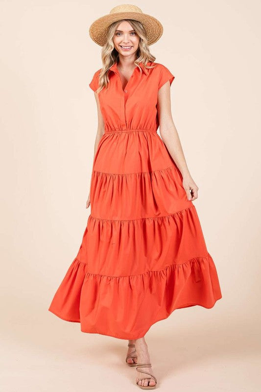 Mittoshop Button Up Collared Tiered Maxi Shirt Dress