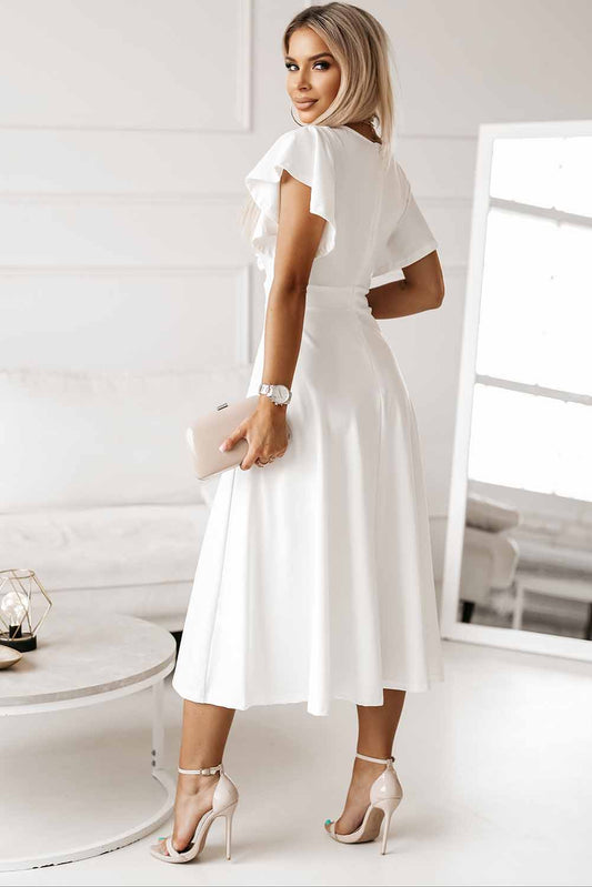 Floral Smocked V-Neck Flounce Sleeve Dress