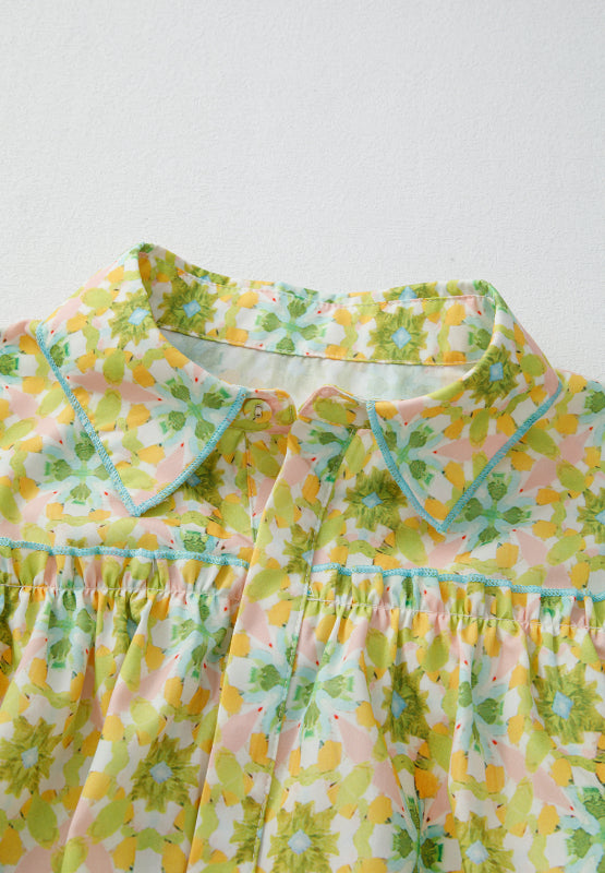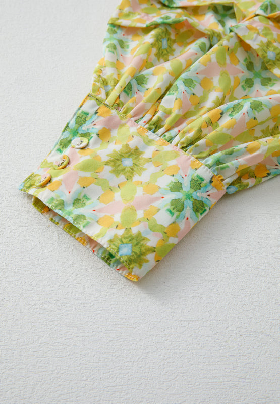 Frill Printed Collared Neck Long Sleeve Blouse